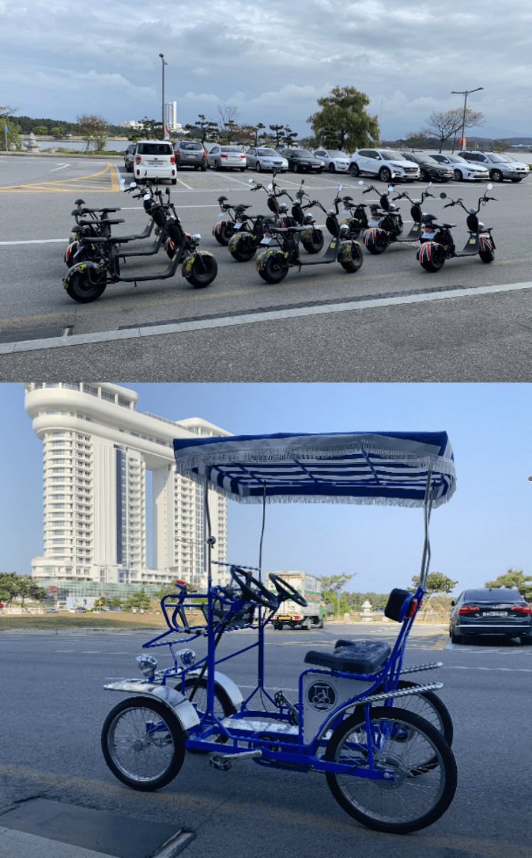 경포호수를 낭만적으로 즐기고 싶다면 전동바이크를 추천드립니다. 2인승도 있기 때문에 사랑하는 연인, 가족과 함께 탈 수도 있습니다. 각자 타는 게 뭔가 서운하다 싶으신 분들께 좋습니다. 물론 전동바이크 말고도 전기자전거, 전기킥보드가 있으니 취향껏 타보시면 좋습니다.