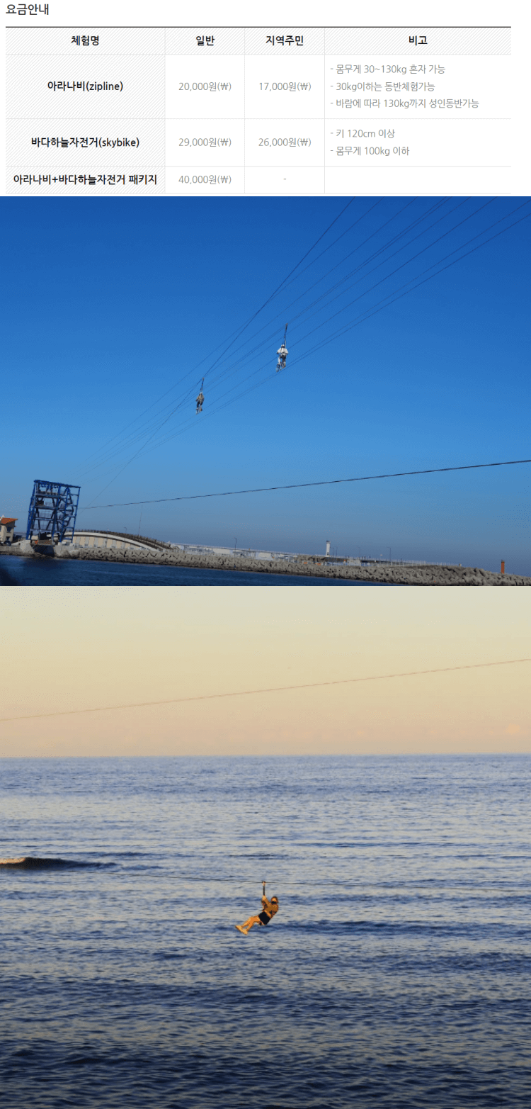 특히 바다하늘자전거는 로프가 위아래 고정되어있어서 안전하긴 하지만 줄 하나에 매달려서 간다는 느낌을 주기 때문에 정말 짜릿하고, 겁이 많으신 분들은 망설이실 것 같습니다. 하지만 이런 체험을 할 수 있는 기회는 흔치 않기 때문에 한 번은 체험해 보시길 추천드립니다.